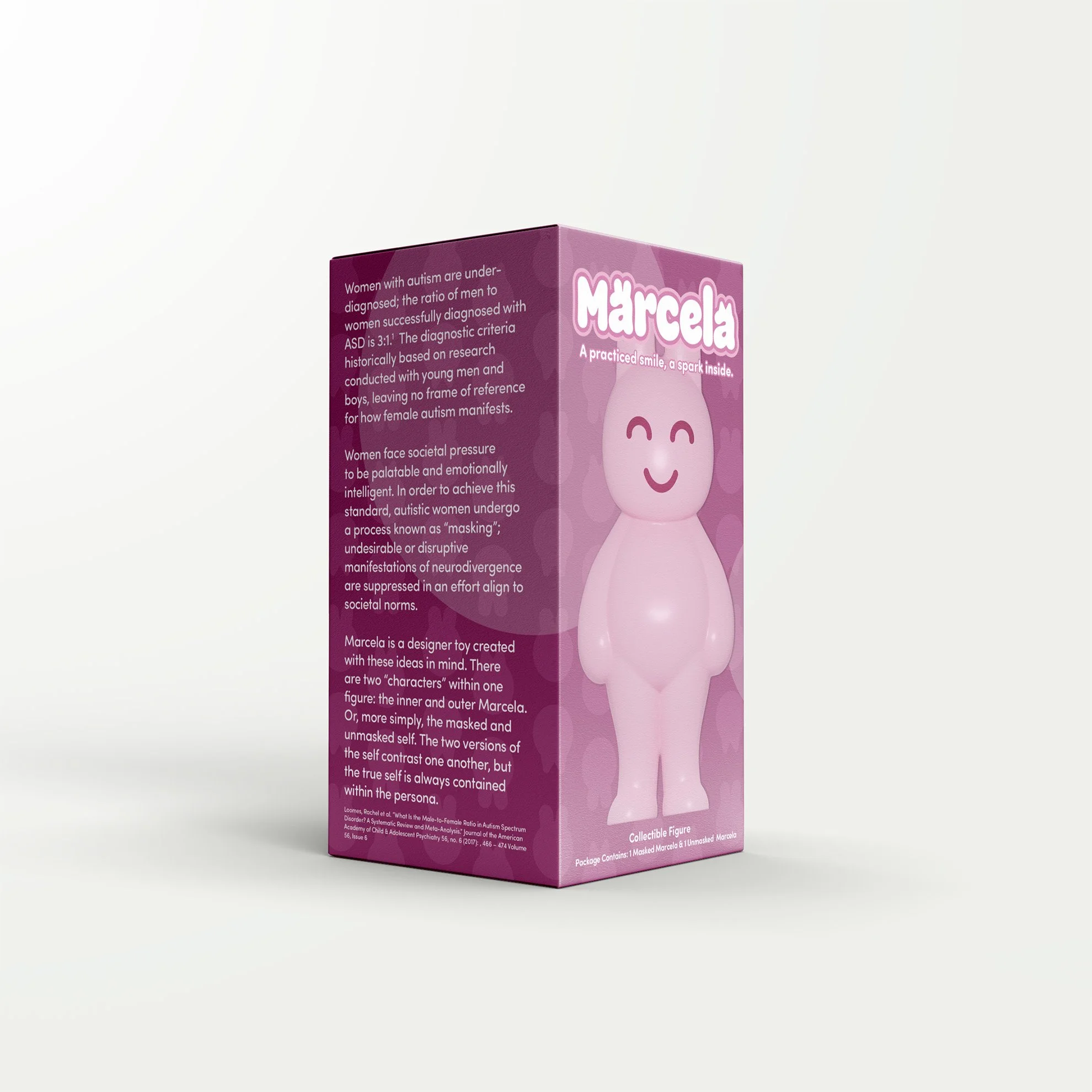 To explore this, Marcela has been created. Using the concept of mass production as a metaphor for the numerous masks that autistic women must create in their lifetime, the external form is smooth and pleasing to the eye, designed to minimize judgment. However, within the core of the form, there exists an unmasked figure. The true self. Jagged, unpolished, and free, she wears her true emotions externally. The two forms, despite their differences, are both Marcela. While the Internal Marcela is kept safe, the External Marcela surrounds her and protects her with the false persona.