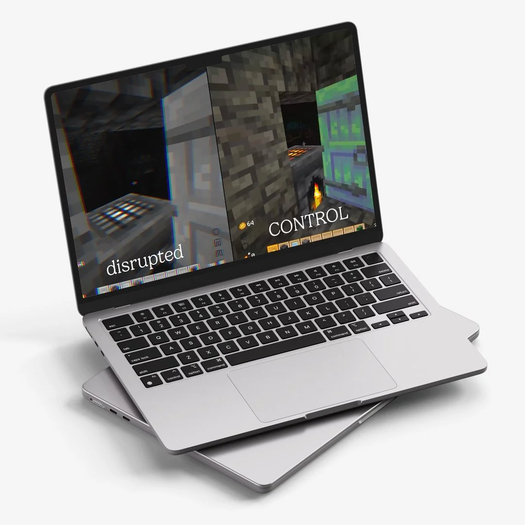 A looping video presents the same Minecraft gameplay scene in two alternating audio conditions separated by brief pauses. In the first, sound guides attention and reinforces space. In the second, layering and persistence increase, reducing hierarchy and clarity. Nothing visual changes. The difference emerges through listening alone. By amplifying contrast between these two conditions, the work makes audible how small design decisions shape cognitive strain. Cognitive Load Theory, first articulated by John Sweller, explains that working memory has limited capacity while long-term memory organizes and stores information.1 Research on auditory attention—including the ‘cocktail party problem,’ which describes how listeners filter competing sounds2—further informs how layering can disrupt focus and increase effort.