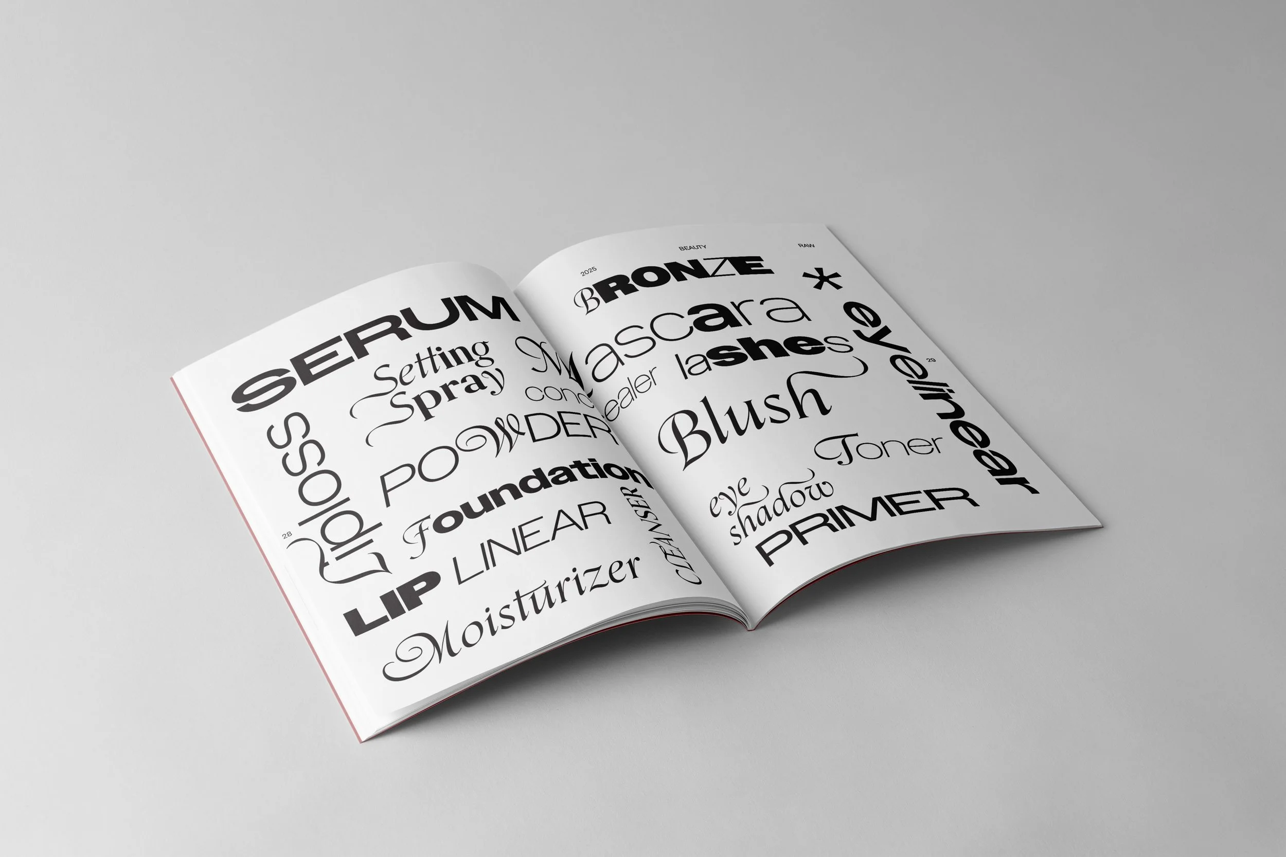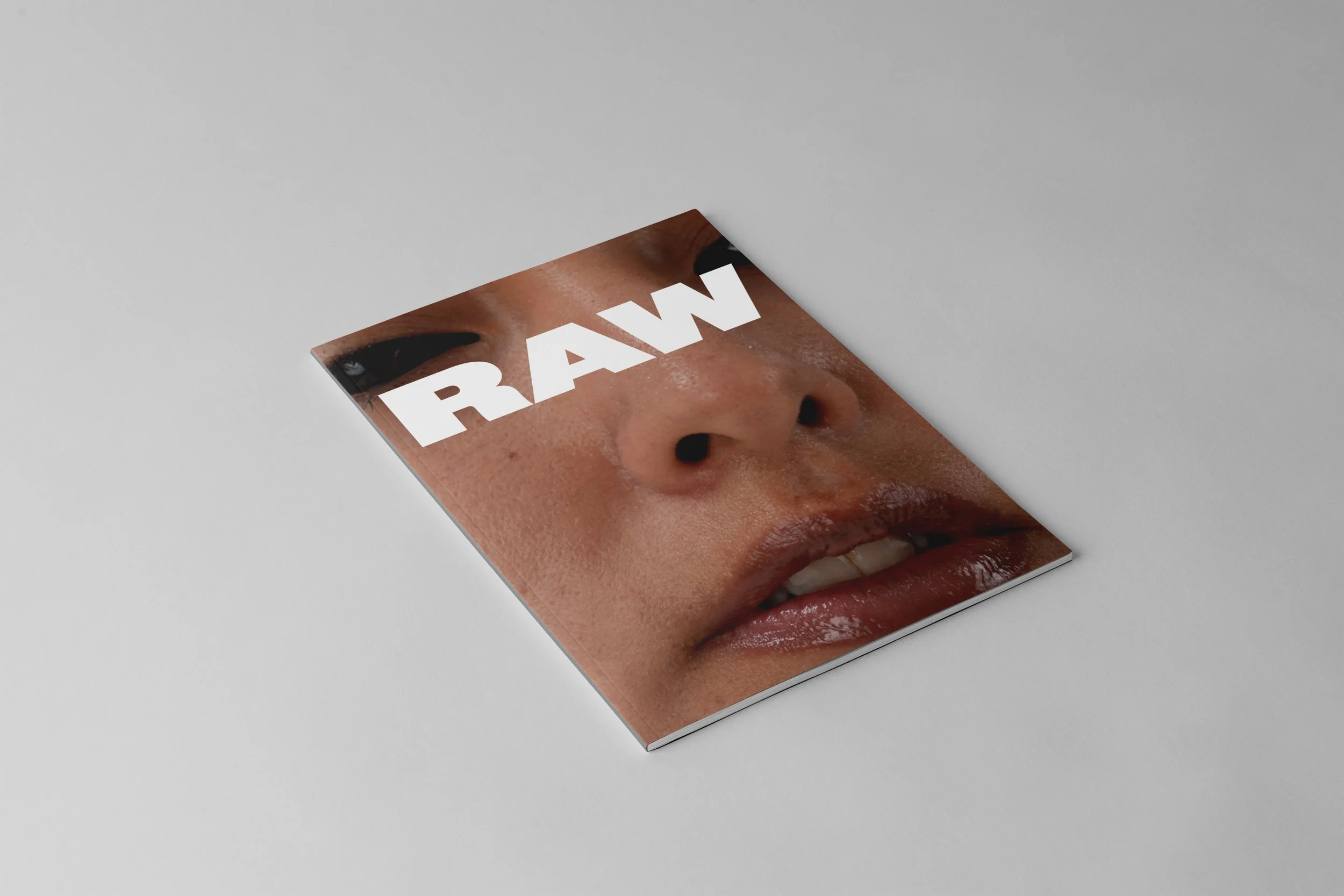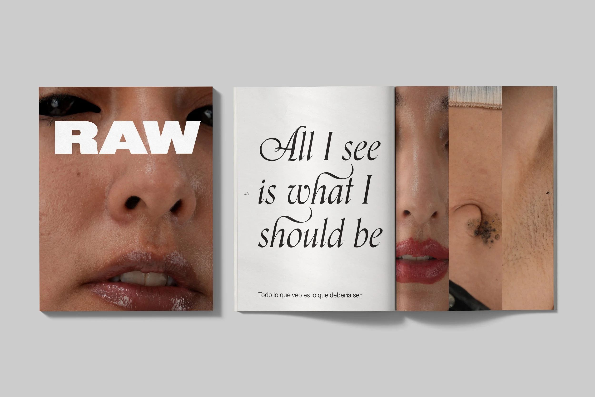 RAW takes the form of both a publication and an installation, featuring minimalist design elements, clinical color palettes, clean typographic systems, and structured compositions that mirror the aesthetic of commercial beauty branding.