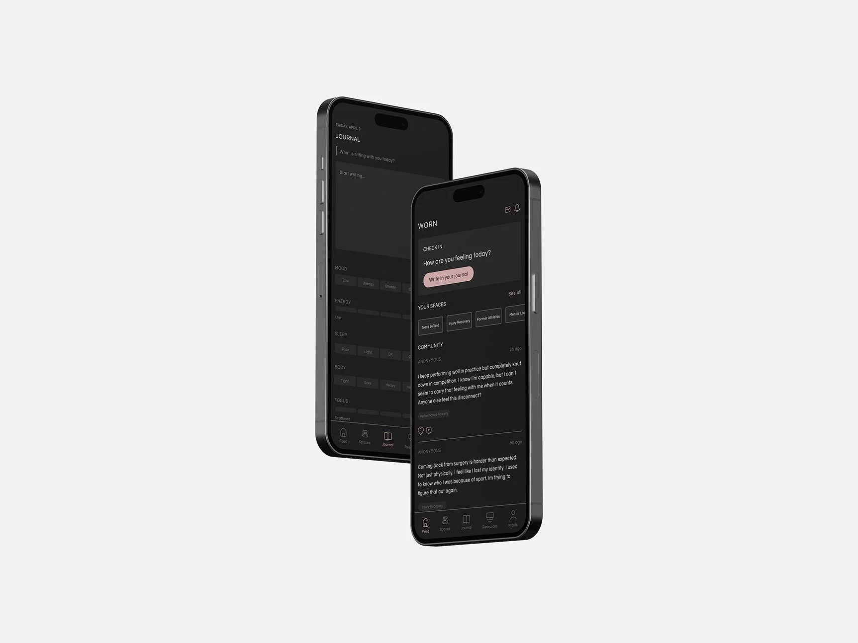 Research in sports psychology and mental health reveals that many athletes struggle to seek support due to stigma, fear of judgment, and the belief that rest or emotional difficulty signals weakness.¹ At the same time, contemporary digital culture encourages constant self-monitoring and comparison, reinforcing the pressure to present a polished and high-performing image. Together, these systems normalize silence and make it difficult for athletes to acknowledge strain. WORN responds by creating a quiet, athlete-focused space for reflection and connection.