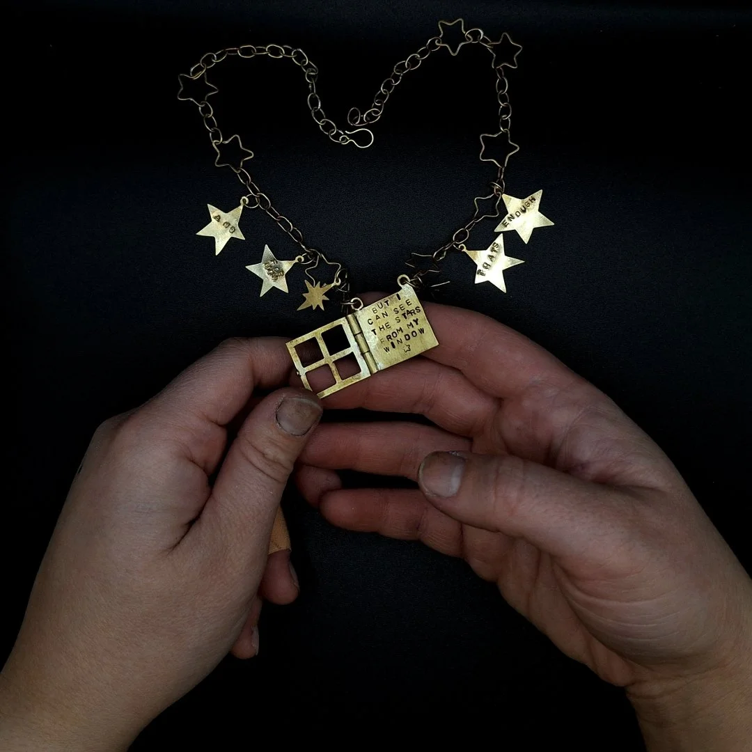 Jewelry—held, worn, given—becomes a way to feel belonging across absence, to make visible the ways we hold onto one another. Every phrase I have hammered into metal, every charm I have cut from it, is a small declaration: YOU ARE HERE; I AM HERE.